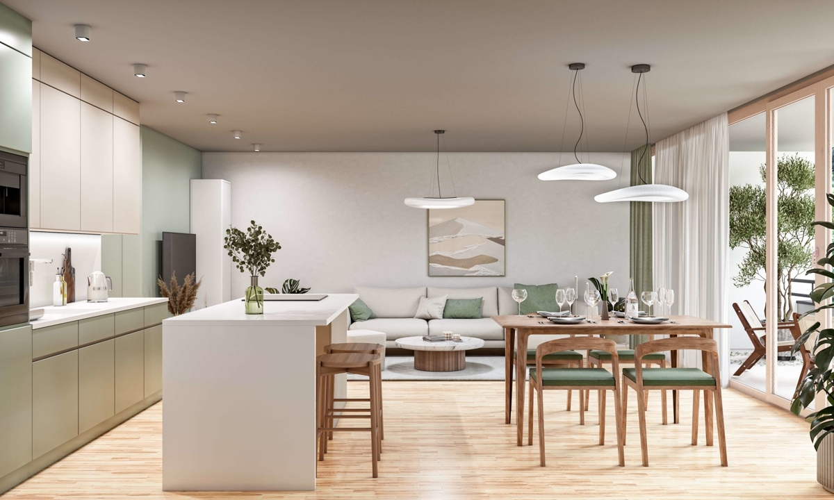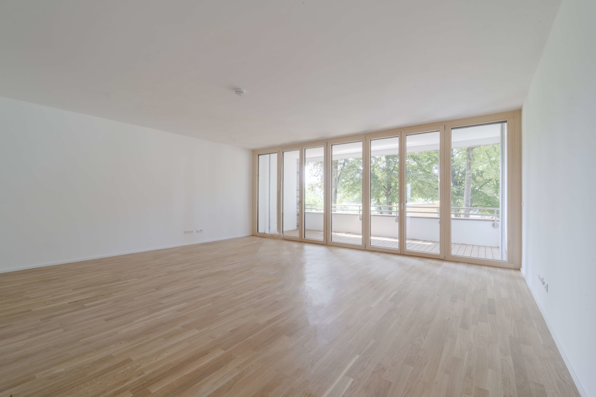 Die besondere, etwa 99 m² große 3-Zimmer-Wohnung bringt alles mit, was man für eine nachhaltige Zukunft braucht. So überzeugt der moderne und durchdachte Grundriss mit einem großen Ess- und Wohnbereich und anliegender überdachter Loggia. Aber auch der Echtholzparkettboden, mit integrierter Fußbodenheizung, oder die übergroßen Holz-Aluminium-Fenster sorgen für ein stimmiges Wohngefühl. Elektronisch steuerbare Außenjalousien können die sonst so lichtdurchfluteten Fenster optimal abdunkeln und somit auch einen 100 % Sichtschutz garantieren.