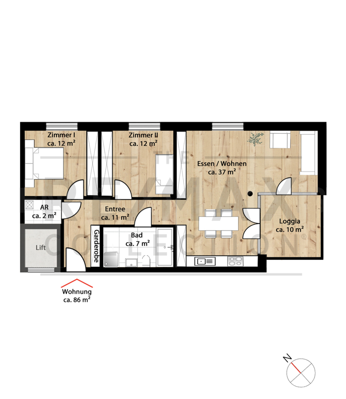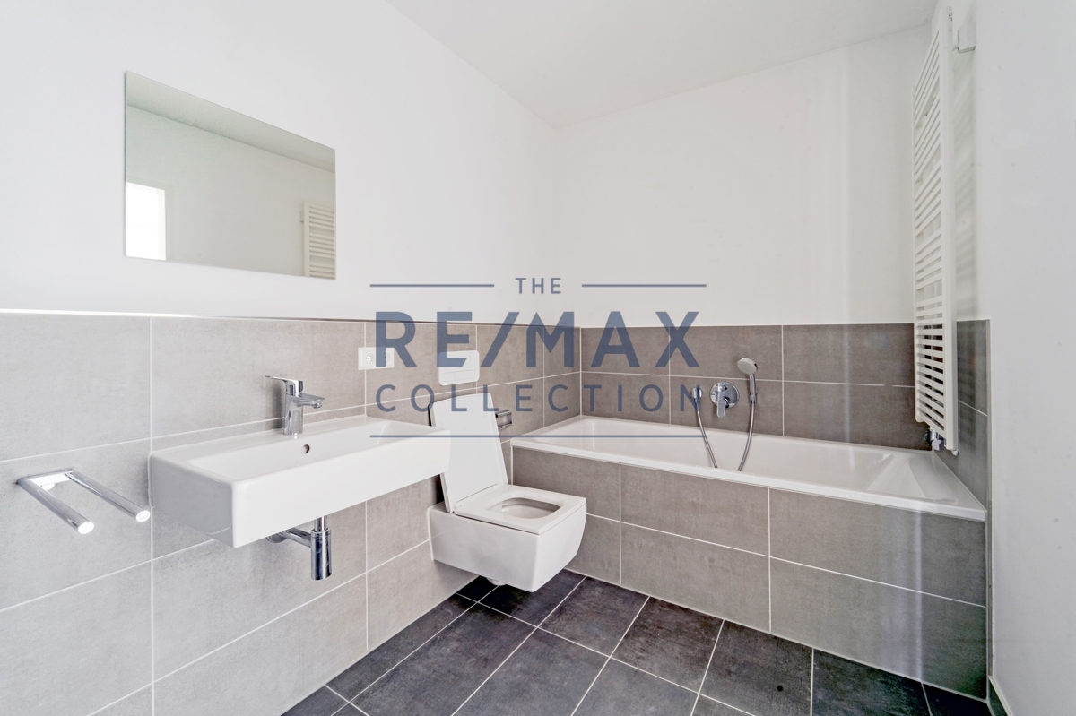 Dusche ebenfalls Badkeramiken von Villeroy & Boch und die Armaturen von hansgrohe. Das Bad wurde in einem schlichten Grau gefliest, was dieses nicht nur modern, sondern auch funktionell und ästhetisch gestaltet. Insgesamt versprüht die Wohnung durch Ihre Ausstattung und Haptik dezenten Luxus.