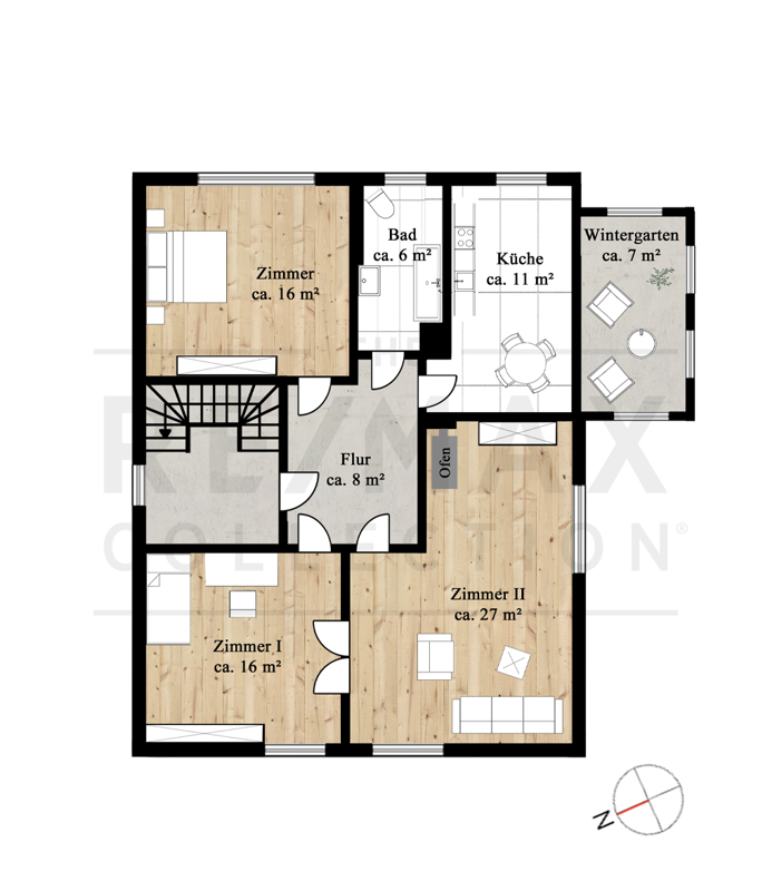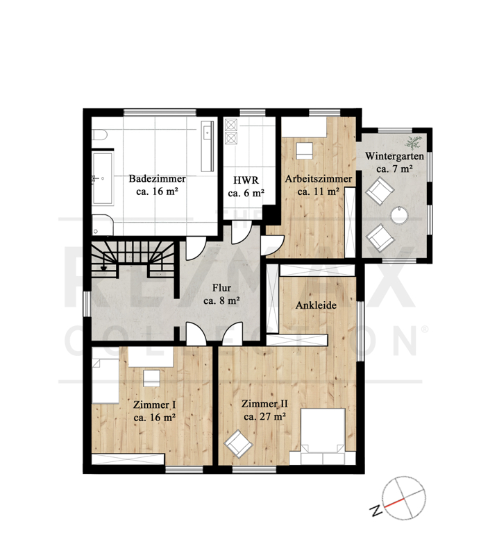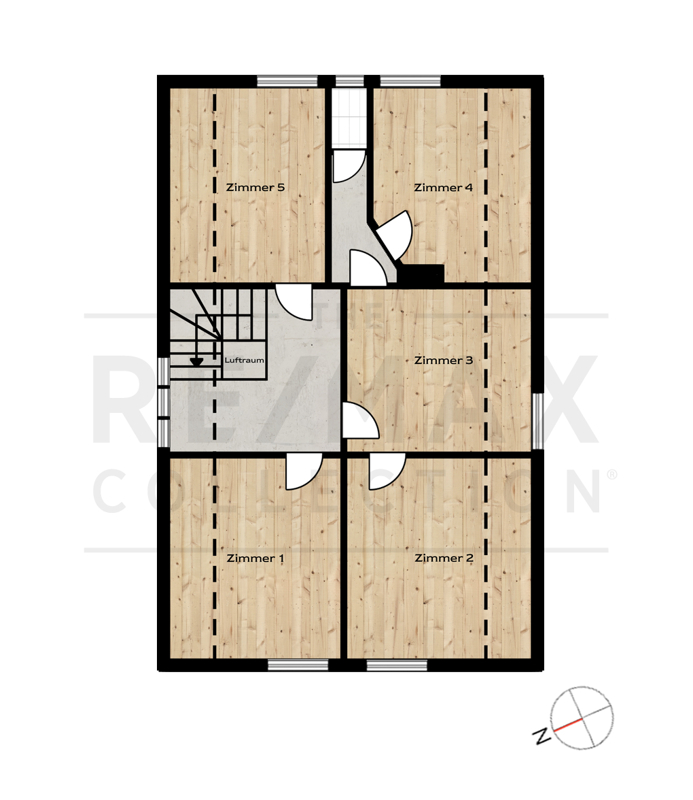 Auf zwei Etagen erstrecken sich fast identische Grundrisse mit originalen Flügeltüren zwischen den Hauptzimmern. Die Zimmer im Dachgeschoss, mit seinen vielen Dachfenstern, könnten der perfekte Kinderbereich sein oder auch als Atelier dienen. Die Räumlichkeiten sind hell und bieten ausreichend Platz, um seinen eigenen Gestaltungsmöglichkeiten freien Lauf zu lassen. Verbunden sind die Geschosse mit einer leicht geschwungenen 30er-Jahre-Holz-Treppe, welche dem Haus einen besonderen Charme verleiht.